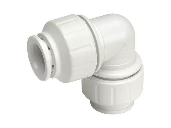JG Speedfit equal elbow push-fit fitting for the connection of equal sized plastic or copper pipe to form a 90° bend.